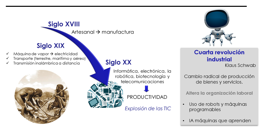 En el siglo XVIII, se cambia el esquema productivo, de lo artesanal se pasó a la manufactura, se introdujo la máquina en la producción y las actividades se vincularon a la mecanización, dando paso a la primera revolución tecnológica, llamada revolución industrial, de acuerdo a Escudero (2009), “proceso de crecimiento económico que, entre las últimas décadas del siglo XVIII y mediados del XIX, experimentaron Gran Bretaña, primero, y, luego, Francia, Bélgica y Alemania” (p. 41), que no solo transformó una economía con predominio en la agricultura a una con preeminencia a la industria y servicios, sino también por el desarrollo económico alcanzando una magnitud hasta el momento desconocida (Escudero, 2009, p. 11). Esto se dio por una serie de factores que se interrelacionaron y que modificaron la forma de vida del hombre.