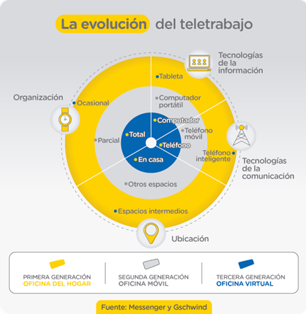 Por lo que, la evolución de esta modalidad de trabajo va a la par de las tecnologías emergentes y dispositivos digitales lo cual puede apreciarse en el Gráfico 2 de Carmona (2020). Asimismo, puede referirse que el Teletrabajo tomo mayor vigencia recientemente por la situación sanitaria global ocasionada por el Coronavirus y el confinamiento durante el año 2020 obligando a dar continuidad de muchos procesos laborales desde las plataformas digitales promoviendo: horarios de trabajo flexible, equilibrio personal y profesional, productividad en el empleo desde espacios remotos, cambio en la cultura y en la forma de organización laboral.