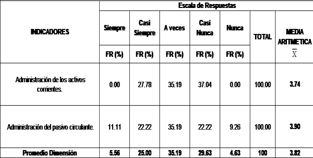 Luego de haber analizada cada uno de los indicadores se puede notar que las respuestas en cuanto a la dimensión capital de trabajo se ubicaron en promedio en un 35,19 % la opción algunas veces, un 29,63 % la opción casi nunca, un 25% la opción casi siempre, un 5,56%  la opción siempre y un 4,63% la opción nunca con una media de 3.82 lo cual se ubica en un nivel de alto cumplimiento en el baremo establecido para esta investigación.
