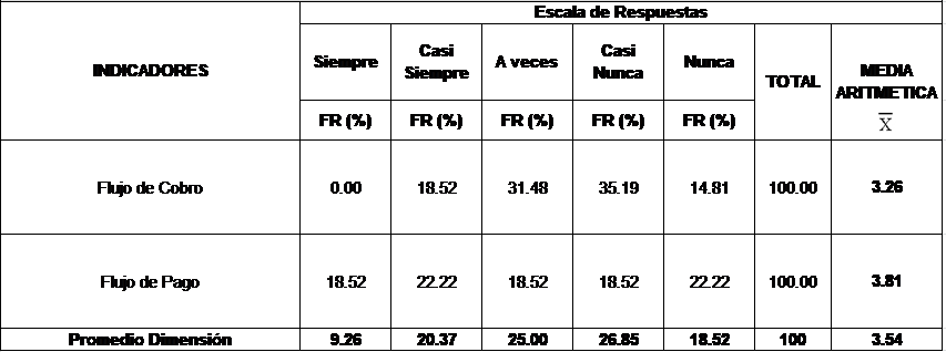 En cuanto al indicador flujo de pago el 22,22% de los sujetos encuestados respondió la opción casi siempre y nunca respectivamente, el 18,52 % la opción siempre, algunas veces y casi nunca respectivamente, es decir, los resultados evidencian una alta  tendencia en cuanto al movimiento de flujo de pagos.