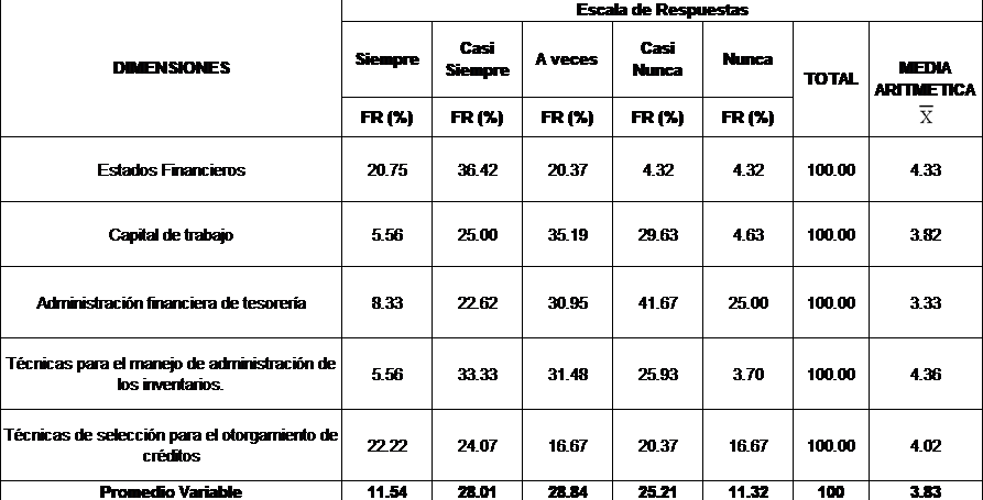 La tabla 4 refleja los resultados acerca del comportamiento de la variable Administración Financiera, donde las unidades informantes respondieron en promedio la opción alguna veces 28.84 %, casi siempre 28,01 %, casi nunca 25,21%, siempre 11.54 % y nunca 11,32%. Presentando una media de 3.83 lo cual se ubica en un nivel de alto cumplimiento en el baremo establecido. Donde se observa que en las organizaciones empresariales aplica una serie de acciones las cuales son enfocadas para lograr un propósito financiero específico, optimizando los recursos financieros para el logro de los objetivos de la organización con mayor eficiencia y rentabilidad.