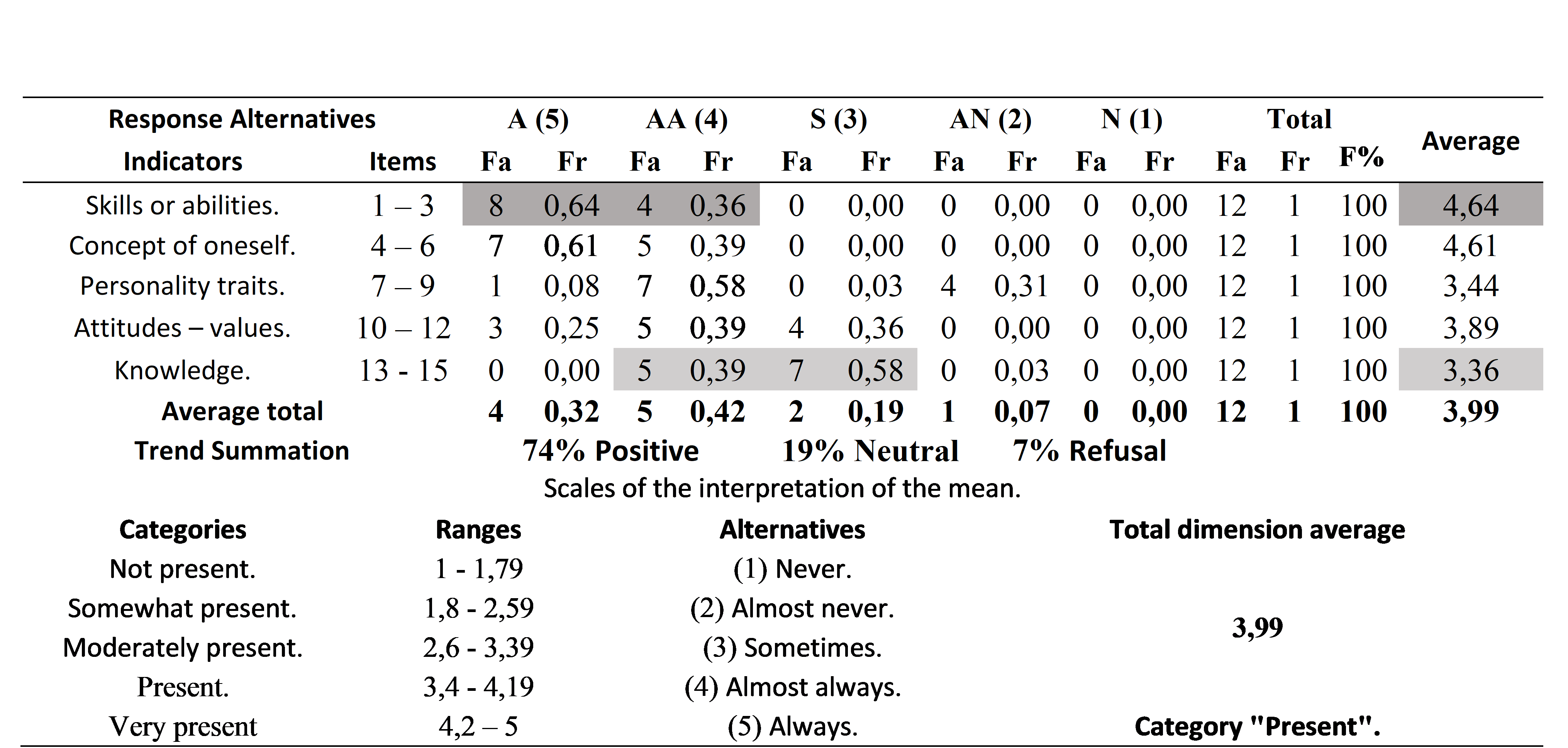 According to Table 6 that refers to the classification of competencies according to their difficulty of detection, it is evident that the total arithmetic mean of the dimension is 3.99 percentage points, reflecting the sum of trends 74% positive, 19% neutral and 7% negative categorizing the dimension as present in the model of human management by competencies in the Hotel Campestre Santa Catalina of the Municipality of San Gil.