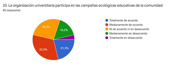 La Universidad de Panamá emplea dentro de sus principios y rutas externas de desarrollo sostenible, campañas ecológicas educativas dirigidas a las comunidades. En este sentido, el 32,5% de la población seleccionada dijo estar medianamente de acuerdo, un 26,3% manifestó estar ni de acuerdo, ni en desacuerdo. Por su parte, el 21,3% manifestó estar totalmente de acuerdo y sólo un 16,2% opinó estar totalmente en desacuerdo.