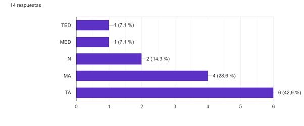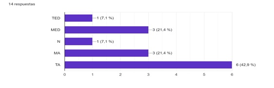 Un 42,9% de los sujetos manifestaron estar totalmente de acuerdo, mientras que el 21,4% manifestaron estar medianamente de acuerdo. Por su parte, el 21,4% de los abordados respondieron estar medianamente de acuerdo y sólo el 7,1% está totalmente en desacuerdo y otro similar neutral.
