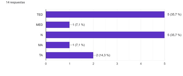 Un 35,7% afirmó estar totalmente en desacuerdo y otro similar porcentaje fue neutral en sus respuestas. Por su parte, un 14,3% de los encuestados manifestaron estar totalmente de acuerdo, mientras que el 7,1% respondieron estar muy de acuerdo y medianamente de acuerdo.