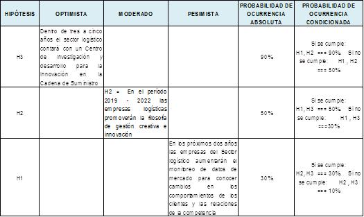 Una previsión optimista supone que la empresa pueda contar dentro de tres a cinco años con un Instituto de Innovación en Logística con una probabilidad del (90%), pero sólo, si se cumplen las otras dos premisas: la promoción de la gestión creativa a partir del 2019 al 2020 (H2), y el monitoreo de datos de mercado para conocer cambios en los comportamientos de los clientes y las relaciones de competencia (H3).