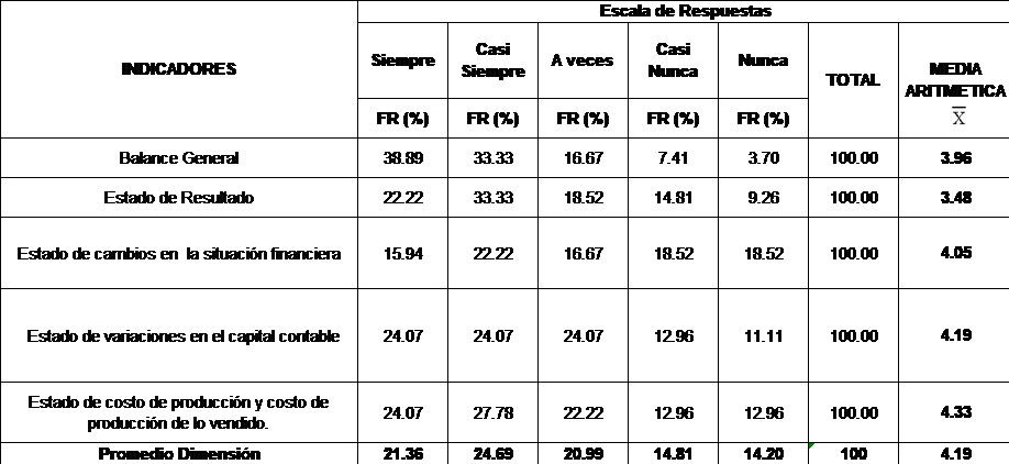 Luego de haber analizada cada uno de los indicadores se puede notar que las respuestas en cuanto a la dimensión estados Financieros se ubicaron en promedio en un 24,69% la opción casi siempre y 21.36% la opción siempre, un 20,99% la opción algunas veces, un 14,81 % la opción casi nunca y un 14,20% la opción nunca, con una media de 4.19 lo cual se ubica en un nivel de alto cumplimiento en el baremo establecido para esta investigación.