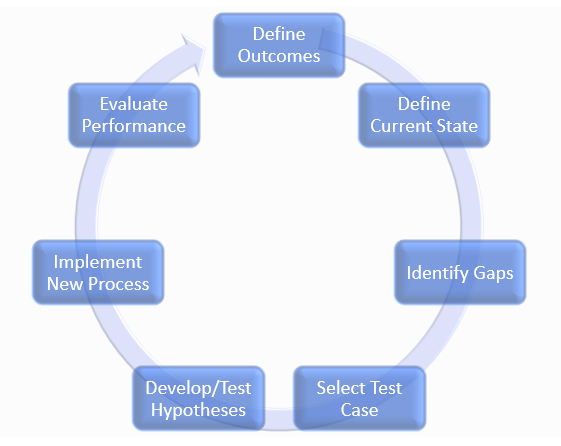 Figure 1 is showing the 7 steps for a Business Process Reengineering where the company needs: 1.- Define Outcomes, 2.- Define Current State, 3.- Identify Gaps, 4.- Select test case, 5.- Develop/Test Hypotheses, 6.- Implement New Process and, 7.- Evaluate Performance