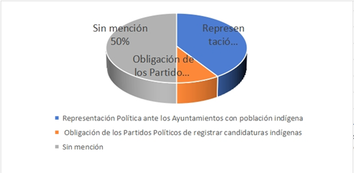 En lo que respecta a la representación política ante los ayuntamientos en los municipios con población indígena, el tema en el país se encuentra en un 41%. Esta cifra podría llegar al 50% si se consideran las disposiciones de la Constitución Política de los Estados Unidos Mexicanos, el 9% que establecen que los partidos políticos deben facilitar la participación política y la representación de grupos étnicos en candidaturas a cargos de elección popular. Bajo este escenario, es claro que no hay suficiente voluntad política.