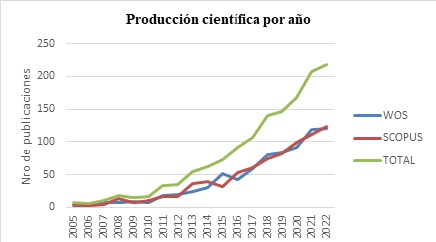 Se realizó un análisis bibliométrico entre los años 2005 y 2022 de los diferentes documentos registrados en WoS y Scopus, estableció la producción total, eliminaron registros duplicados y presentaron los siguientes resultados.