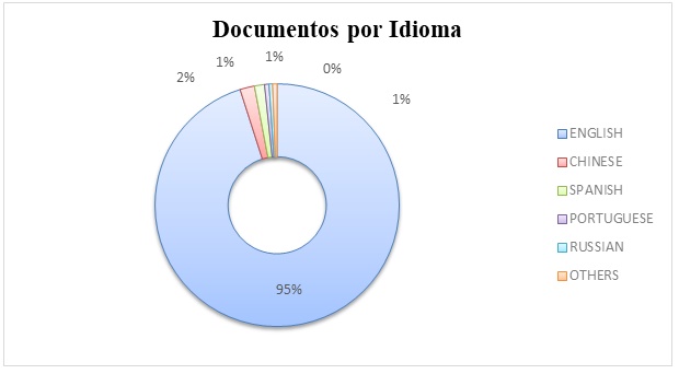 Fuente: Autores. (2023).Como se puede observar en la figura 1, se identifica que el 95% de las publicaciones se encuentra en idioma inglés, mientras un 2% en chino y en otros idiomas el 3%. El idioma inglés es el que más predomina, debido a que la mayoría de los autores escriben sus documentos en este idioma, con el propósito de lograr una mayor visibilidad (Vera et al., 2019).